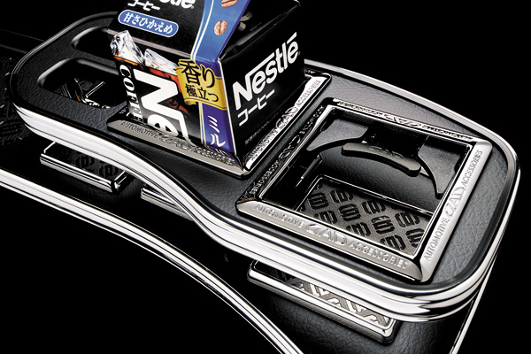 ドリンクホルダー部分はツーウェイアジャスターにより缶サイズに合わせて使用が可能。コースターとトレー部にはエピ調レザー(標準タイプ)を配した最高級のフロントテーブル。